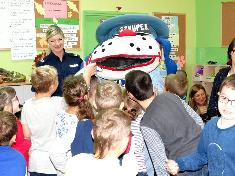 Bytomscy stróże prawa, wraz z maskotką śląskiej policji psem „Sznupkiem”, odwiedzili najmłodszych w Szkole Podstawowej nr 2. Mundurowi uczyli dzieci jak unikać zagrożeń i bezpiecznie poruszać się po drodze. Z uczniami rozmawiano także na temat ich bezpieczeństwa podczas zabaw na podwórku, przejazdu samochodem, w kontaktach z obcymi i zwierzętami. Najmłodsi z dużym zaangażowaniem uczestniczyli w prelekcji. Chętnie odpowiadali na pytania, oglądali wyposażenie służbowe mundurowych. Na zakończenie z radością przywitali „Sznupka”. Dzieci przytulały się do niego i pozowały do pamiątkowego zdjęcia. /tekst www.bytom.slaska.policja.gov.pl/