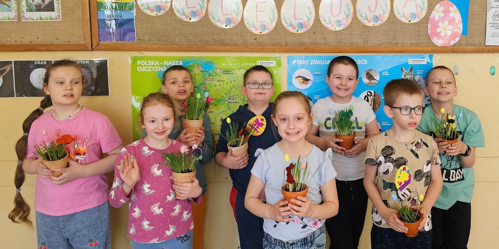 Wielkanoc tuż-tuż, a my już od tygodnia żyjemy wiosennymi przygotowaniami! Uczniowie z klas 1a i 1d z wielkim zaangażowaniem sadzili owies, żonkile i inne wiosenne kwiatki. Każdego dnia z troską doglądali swoich roślin, podlewali je i obserwowali jak stają się coraz piękniejsze. Kiedy kwiaty w pełni rozkwitły, nadszedł czas na wielkanocną magię. Dzieci wykonały urocze stroiki, które ozdobią świąteczny stół. Niech ta radość i świeżość wiosny zagości także w domach. Życzymy spokojnych i radosnych świąt.